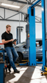 Kfz-Mechaniker mit Tablet in moderner Werkstatt vor Auto.